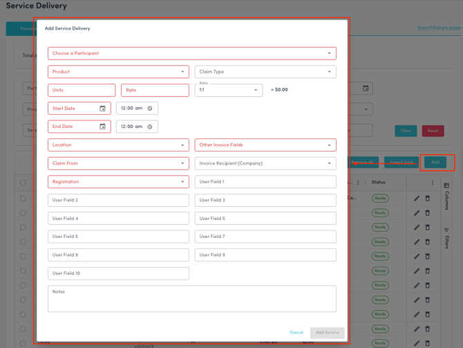 You can manually add a service delivery record by clicking the Add button.